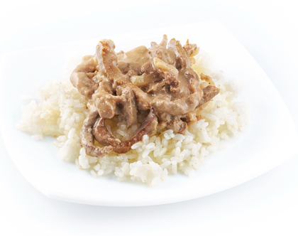 ПЕЧЕНЬ ПО-СТРОГАНОВСКИ С РИСОМ