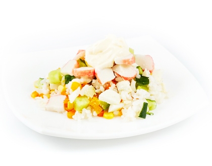 рис, палочки крабовые, огурец свежий, яйцо, кукуруза консервированная, морковь, майонез, хлеб тостовый, соль
